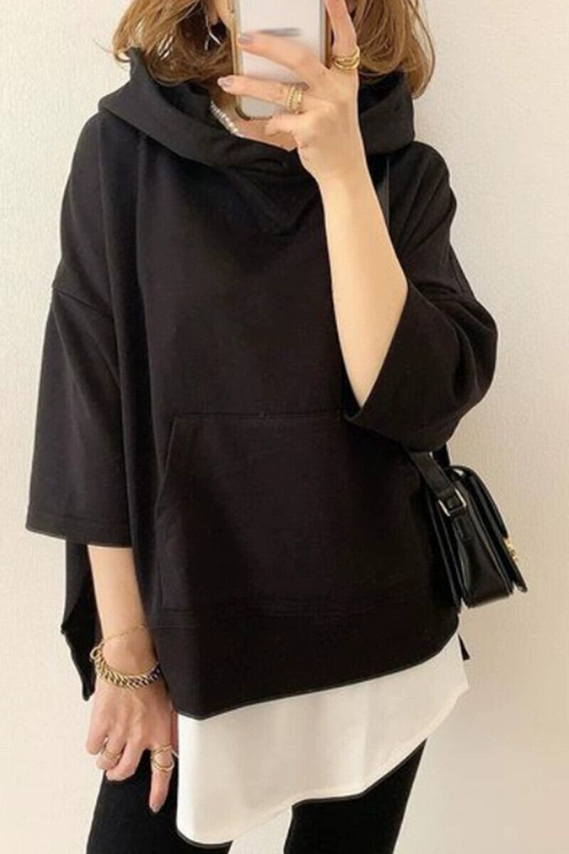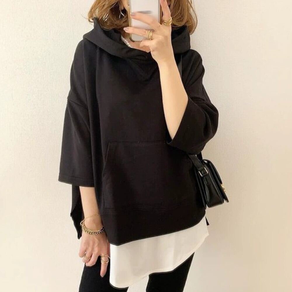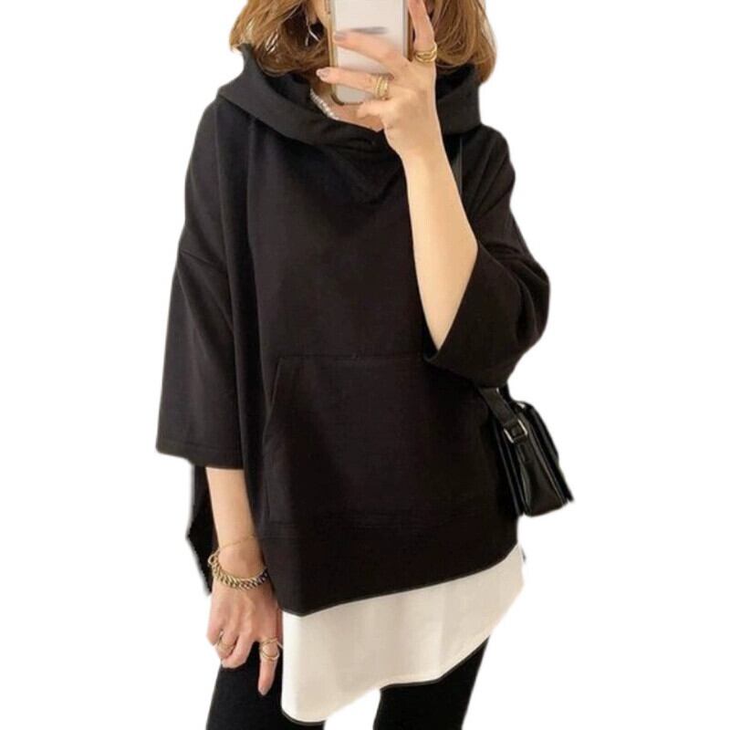 怠惰なスタイル無地トップス女性 2022 新しい秋の ese スタイルカジュアルルーズフェイクツーピーススプライシングフード付きスウェットシャツトレンディ オータム 秋物 ソリッドカラー cat839902692488