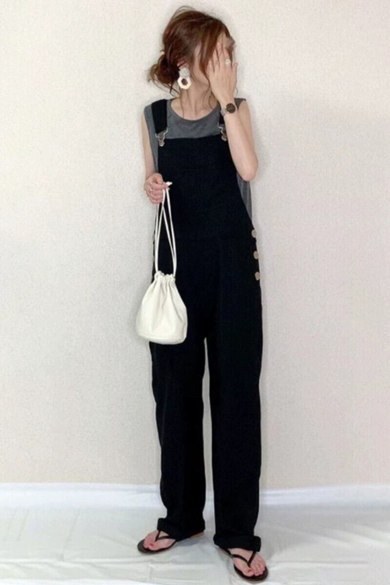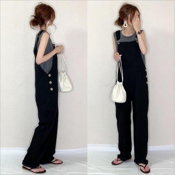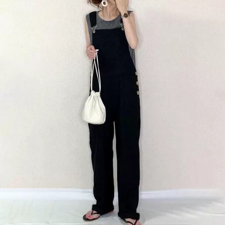 これらの春と夏の新しいスタイル怠惰なスタイル年齢を軽減する痩身ハイウエスト黒カジュアルルーズジャンプスーツオーバーオールワイドレッグパンツ ブラック スプリング 春物 サマー 夏物 cat865419136409