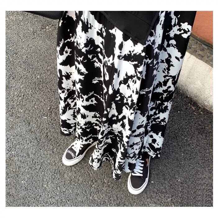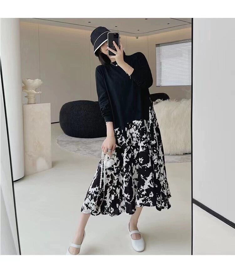 2021 大きいサイズ秋の女性のニット長袖 Tシャツスプライスプリントスイングドレスラウンドネックフェイクツーピースロングスカート 大きめサイズ オータム 秋物 Oネック cat838564467112