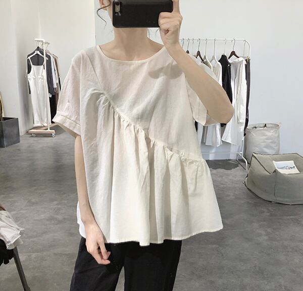不規則なコットンとリネンのシャツの女性、夏の新しいスタイル、シンプルなプリーツプルオーバー、ルーズでスリムなスタイルのラウンドネック半袖トップ サマー 夏物 Oネック cat887870751495