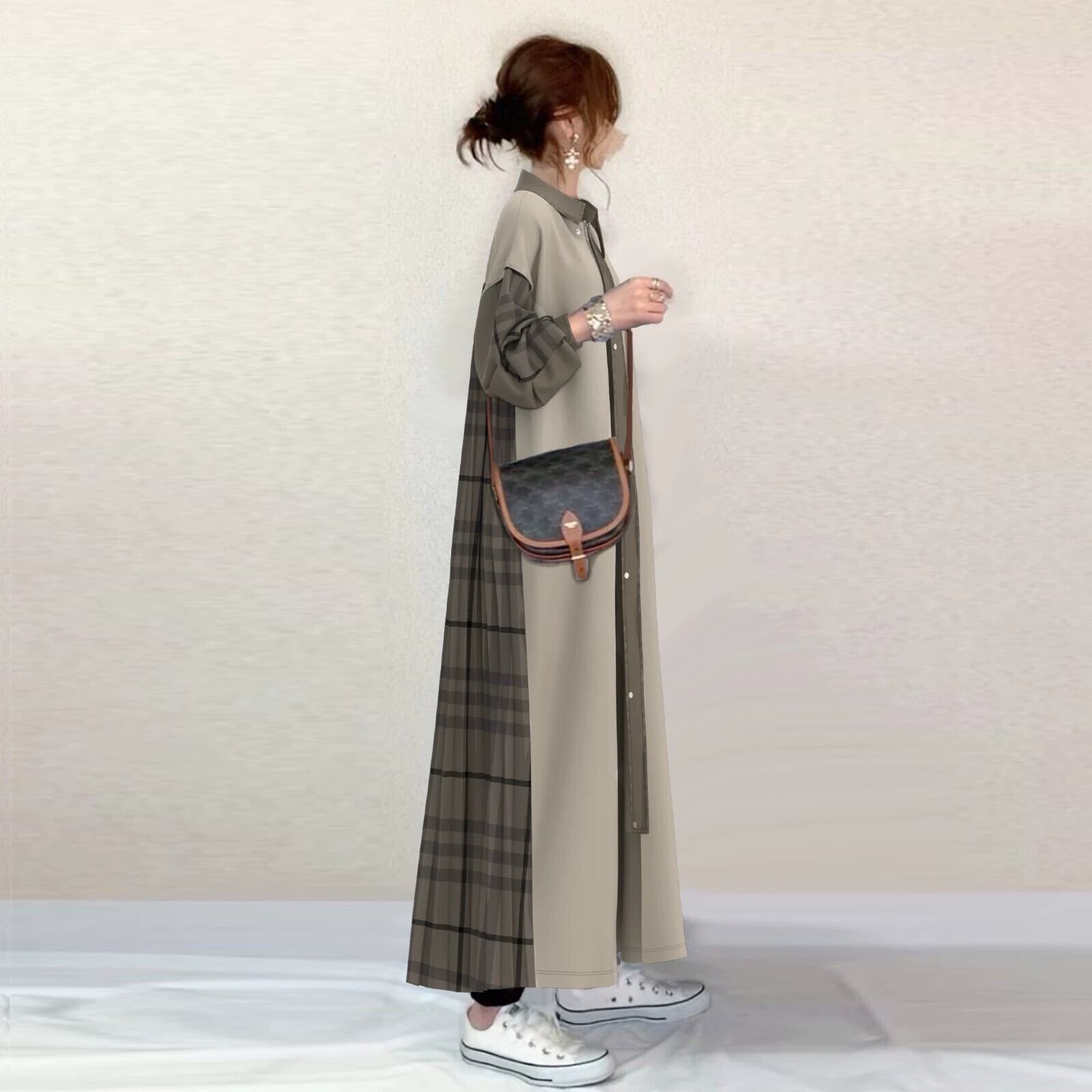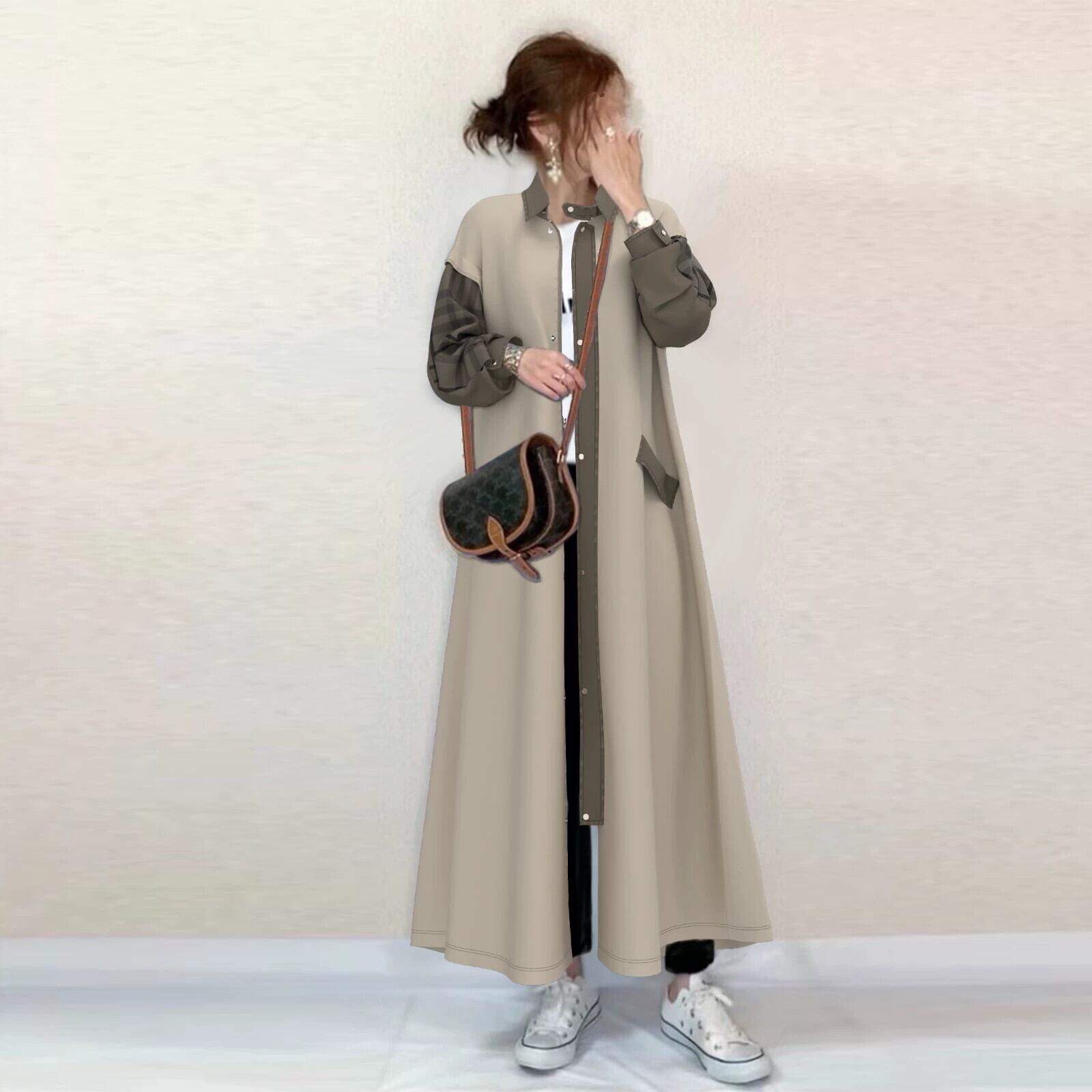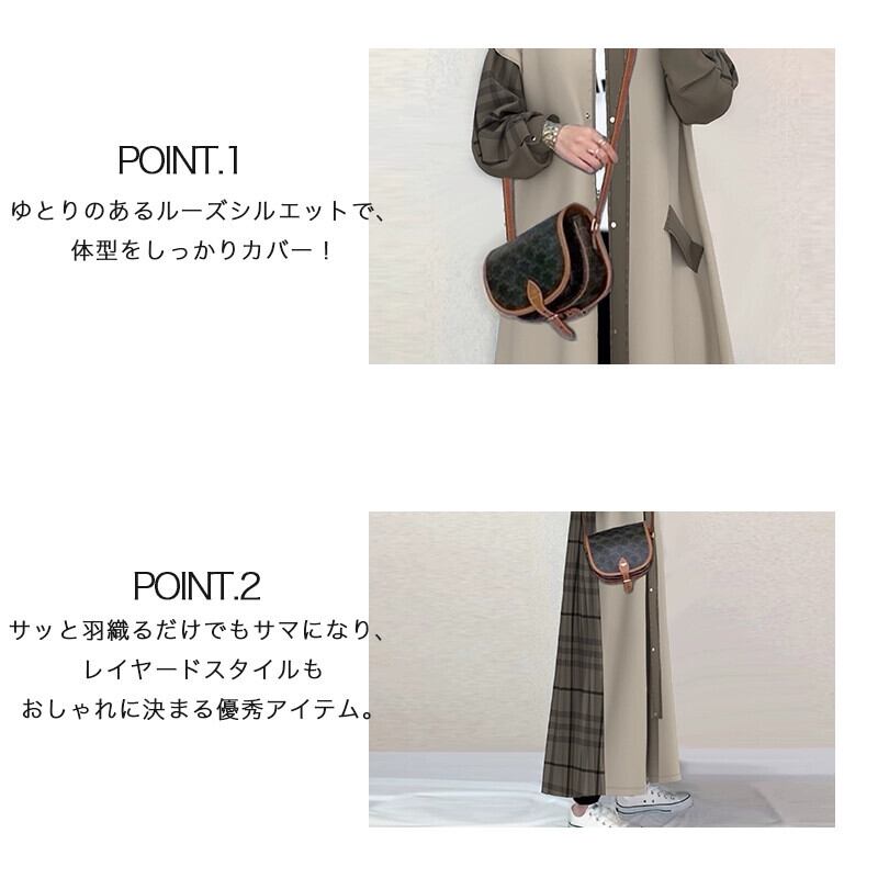 スポット ese 2023 秋冬新スタイル折り襟カーディガン長袖コントラストチェック柄スプライシングウインドブレーカー ロング オータム 秋物 ウィンター 冬物 cat829915628543