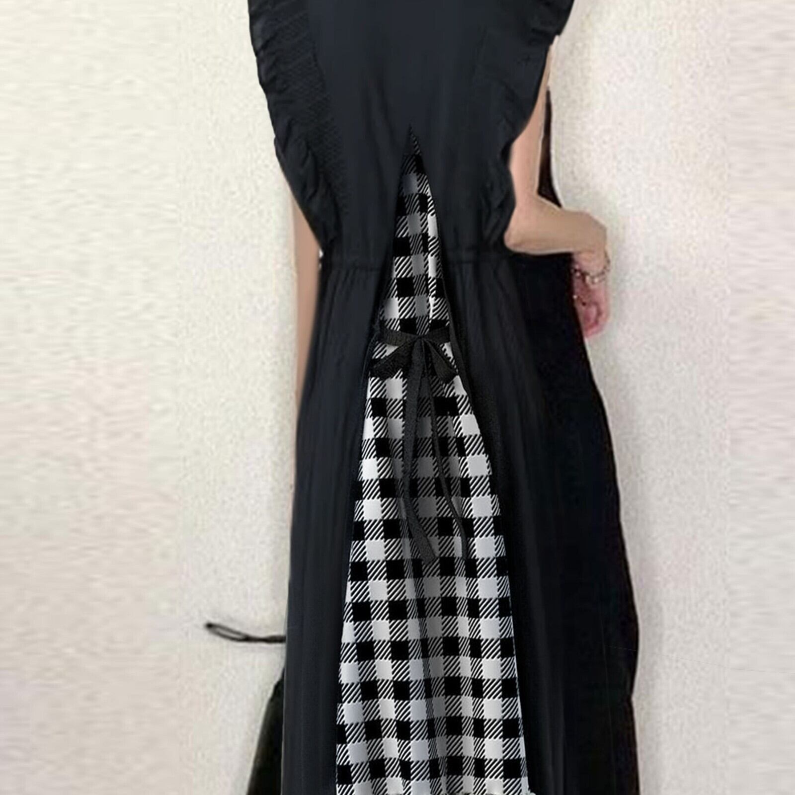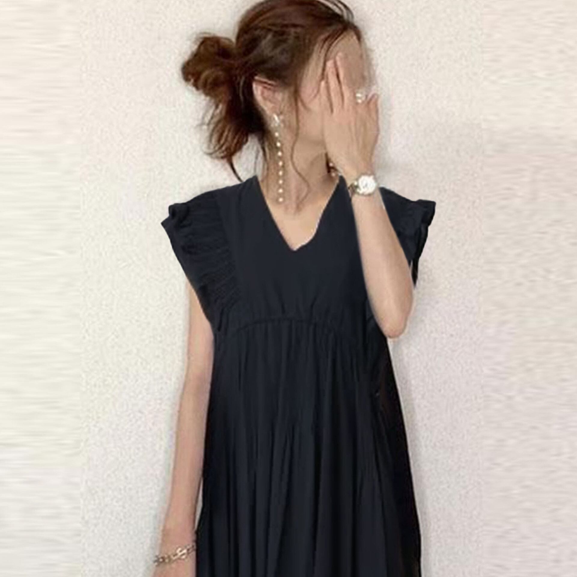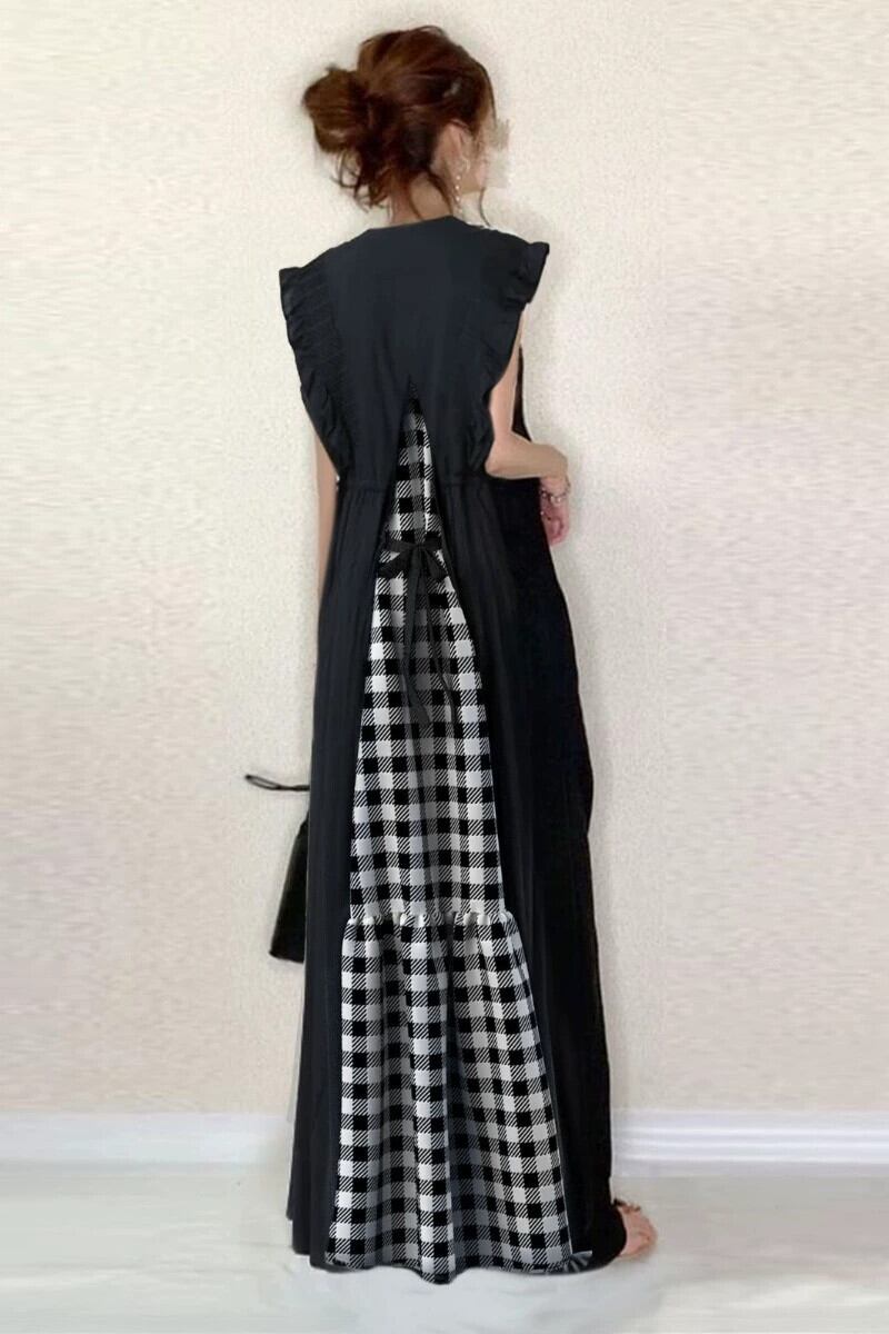 在庫あり 2023 春夏ロングスタイルフライングスリーブ V ネックバックタイチェック柄小さな V ネックロータスリーフスリーブドレス スプリング 春物 サマー 夏物 Vネック cat852374575521