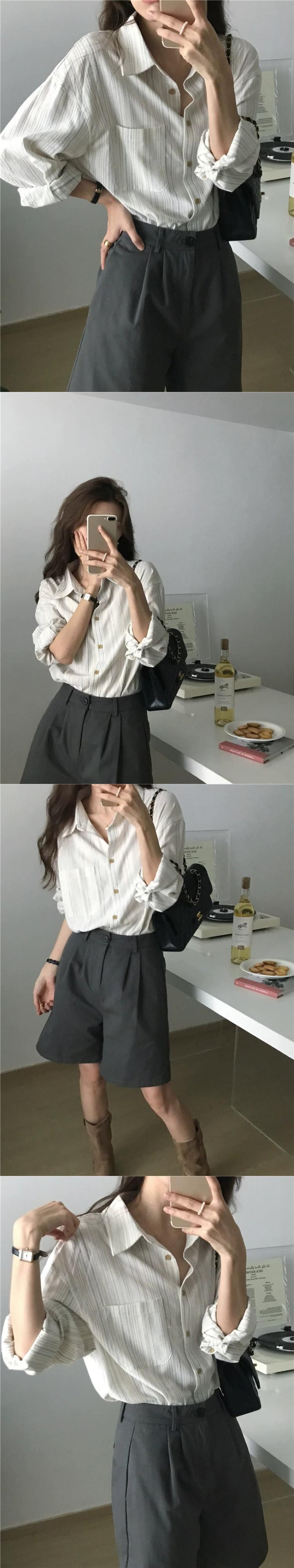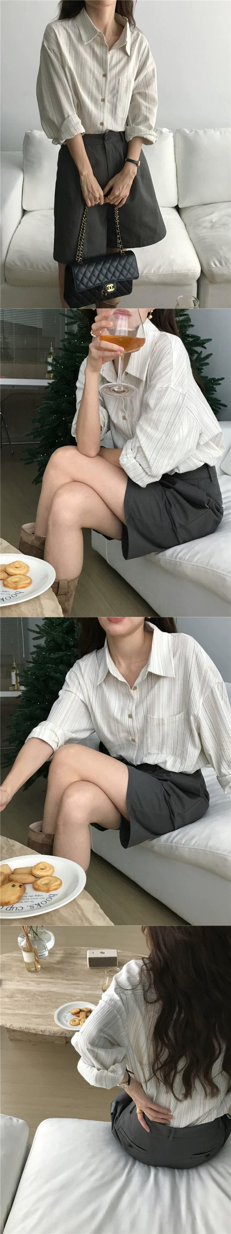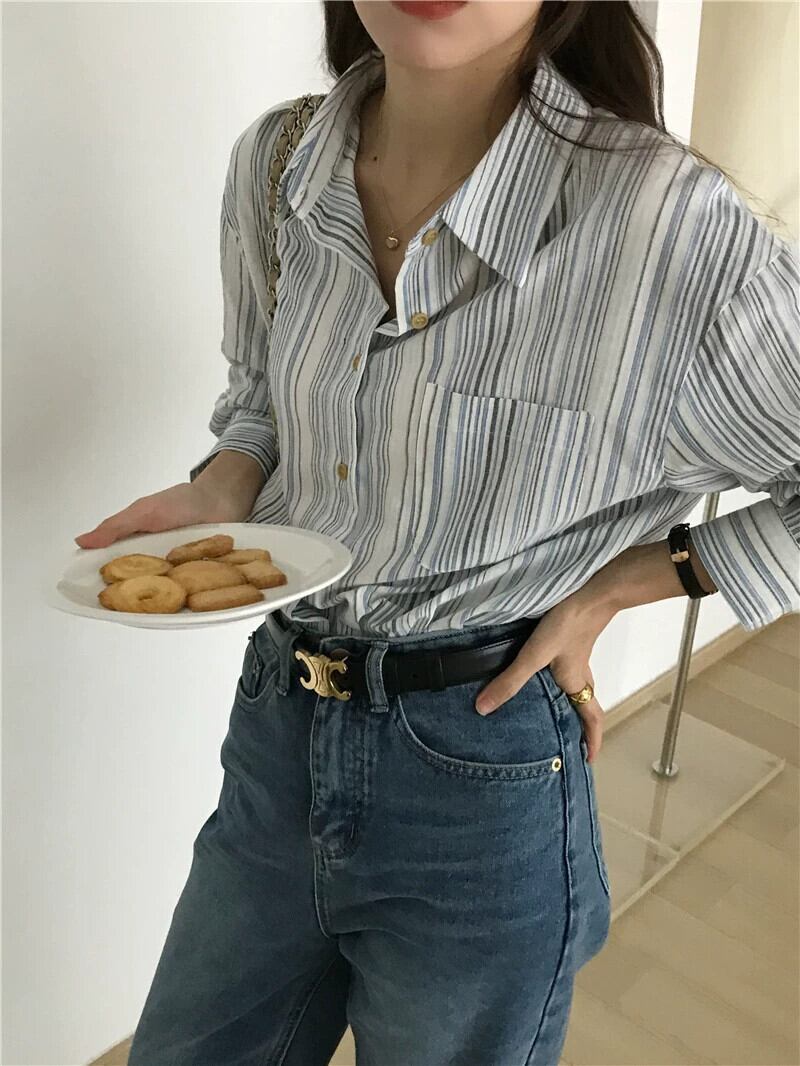 リアルS&リアルプライススタイル シンプルで万能なストライプ綿麻ポロカラー長袖シャツ 2色入荷 ロング コットン cat817866345339