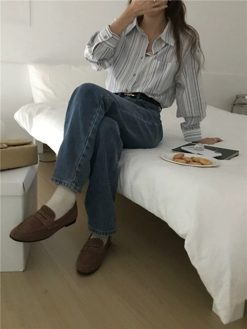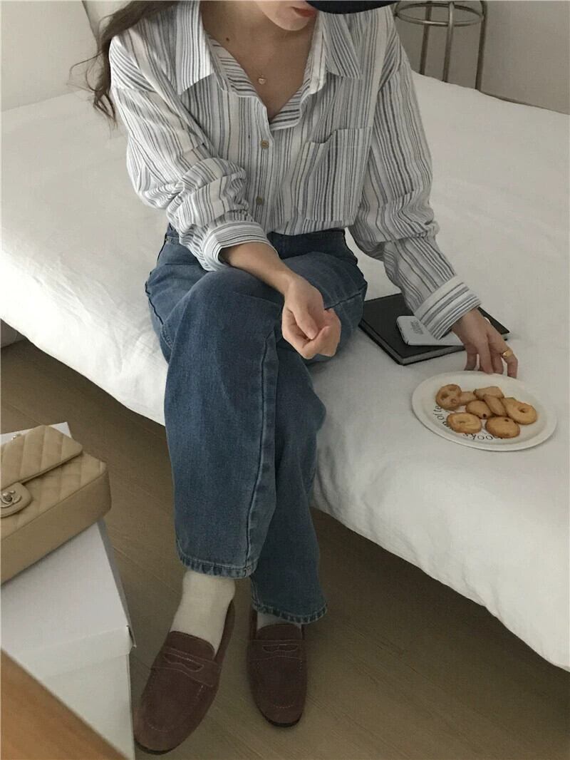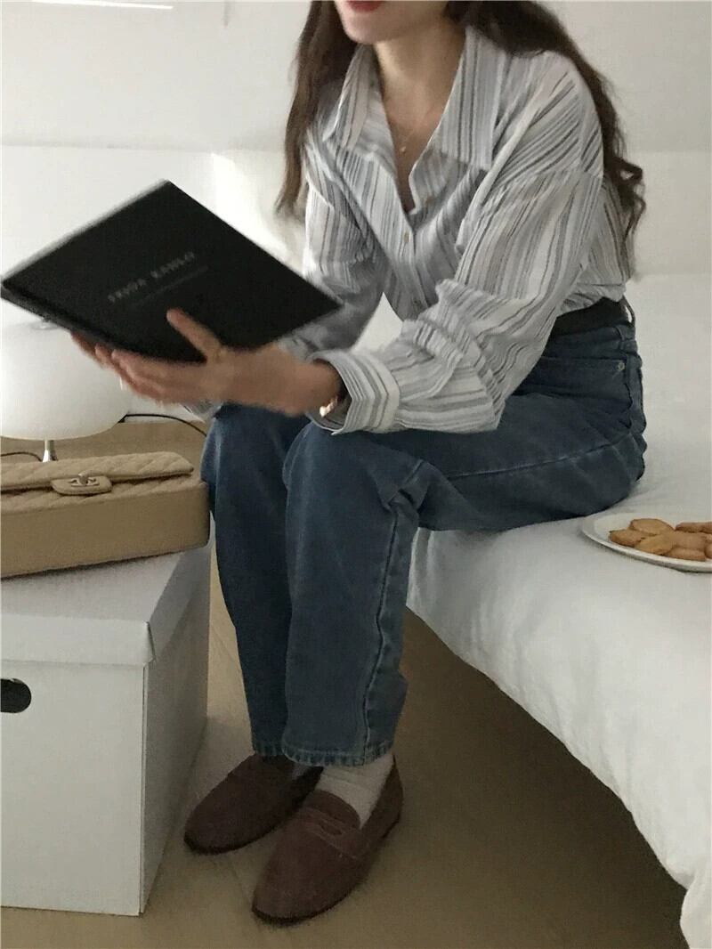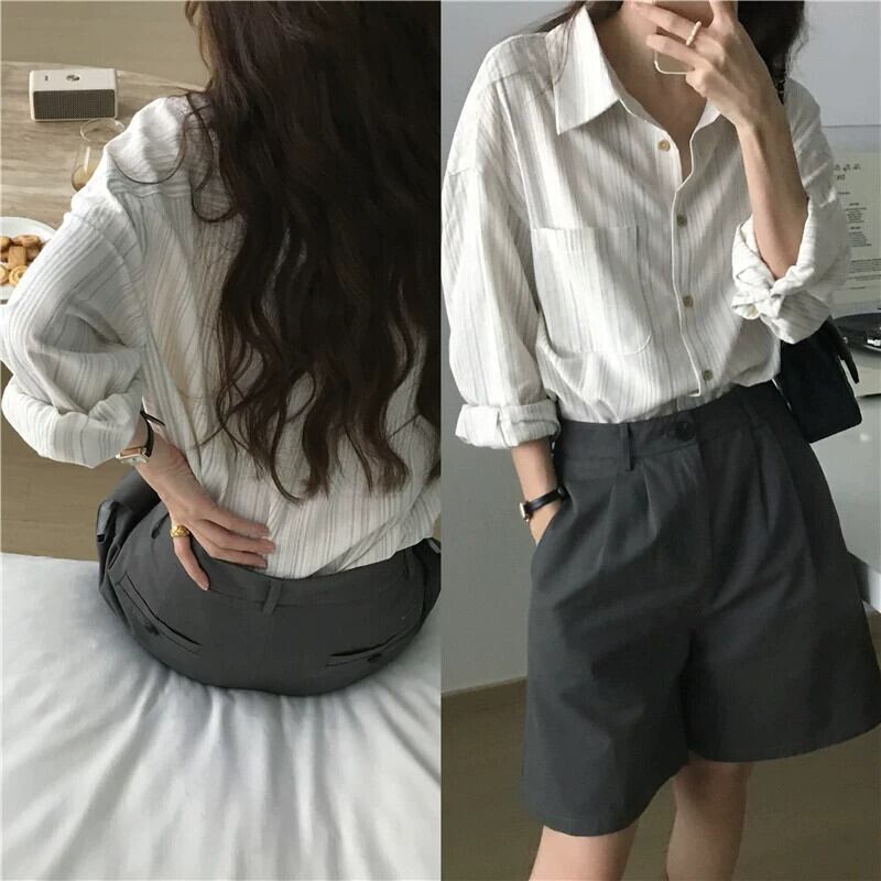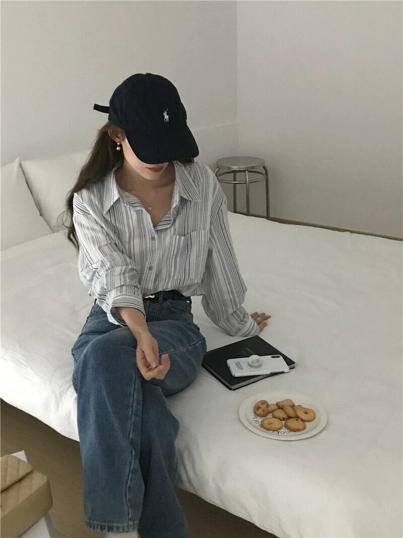 リアルS&リアルプライススタイル シンプルで万能なストライプ綿麻ポロカラー長袖シャツ 2色入荷 ロング コットン cat817866345339