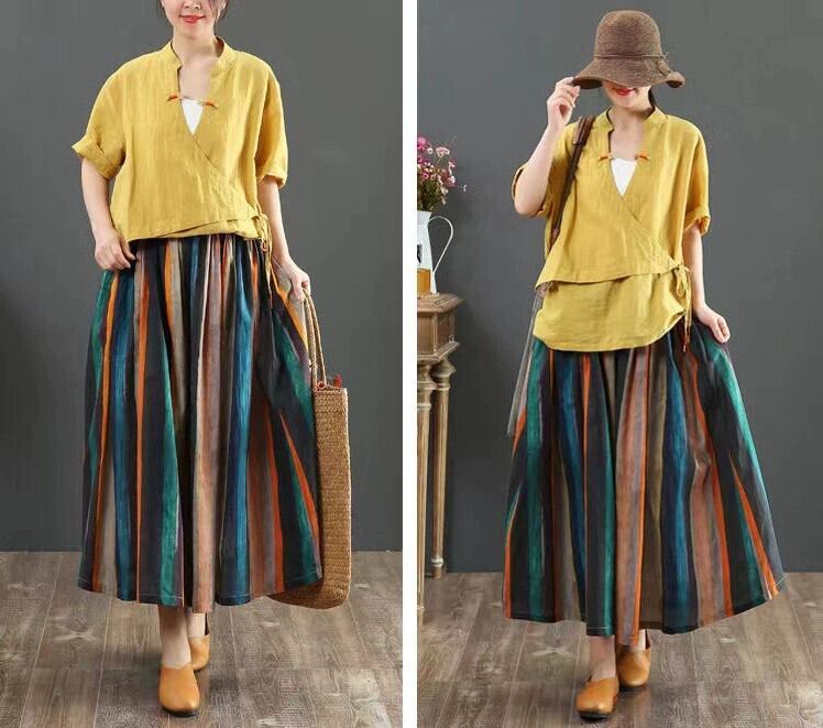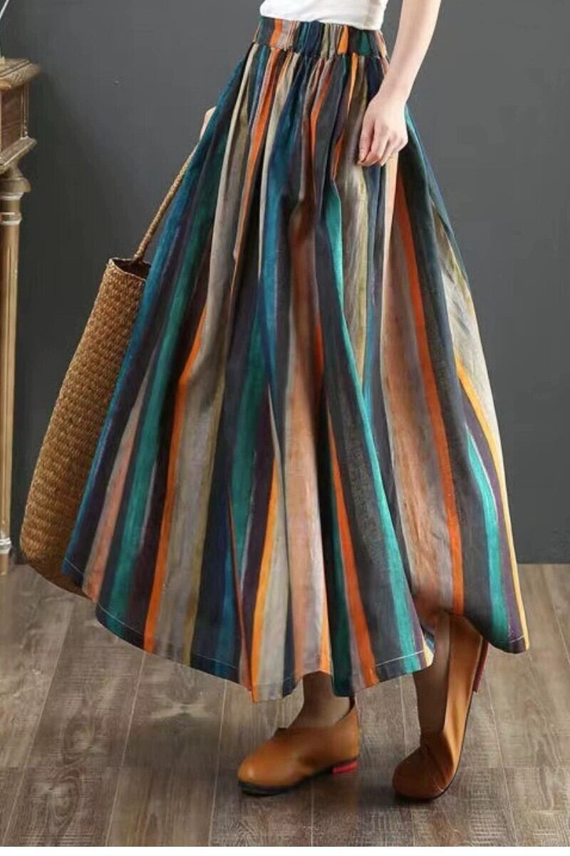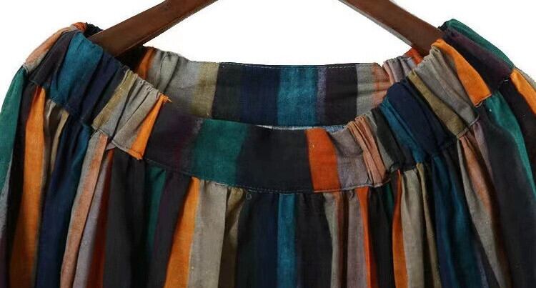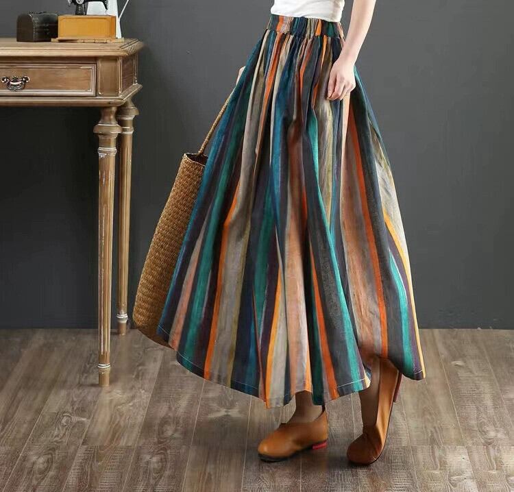 クロスボーダーの新しいコットンとリネンの多用途 A ラインスカートルーズ文学スタイルのストライプの印刷と染色ミッドレングスのプリーツスカートの女性 Aライン cat839711745978