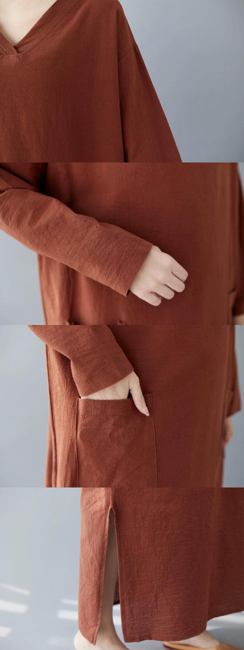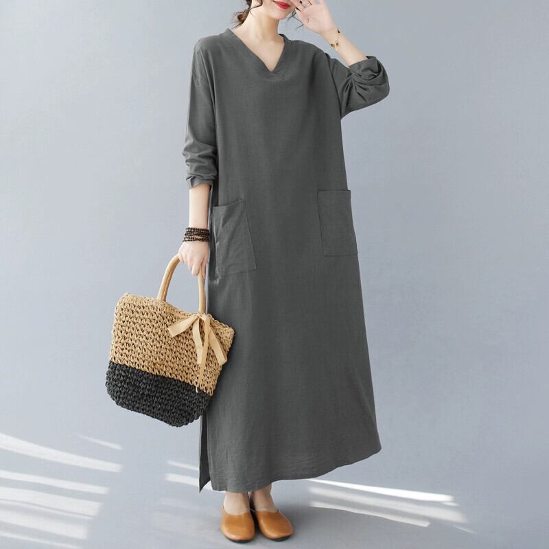 スポットリアル s 2023 新しいレトロなコットンとリネンの V ネックプラス太くて拡大されたルーズな長袖ドレス ロング Vネック cat861747594287