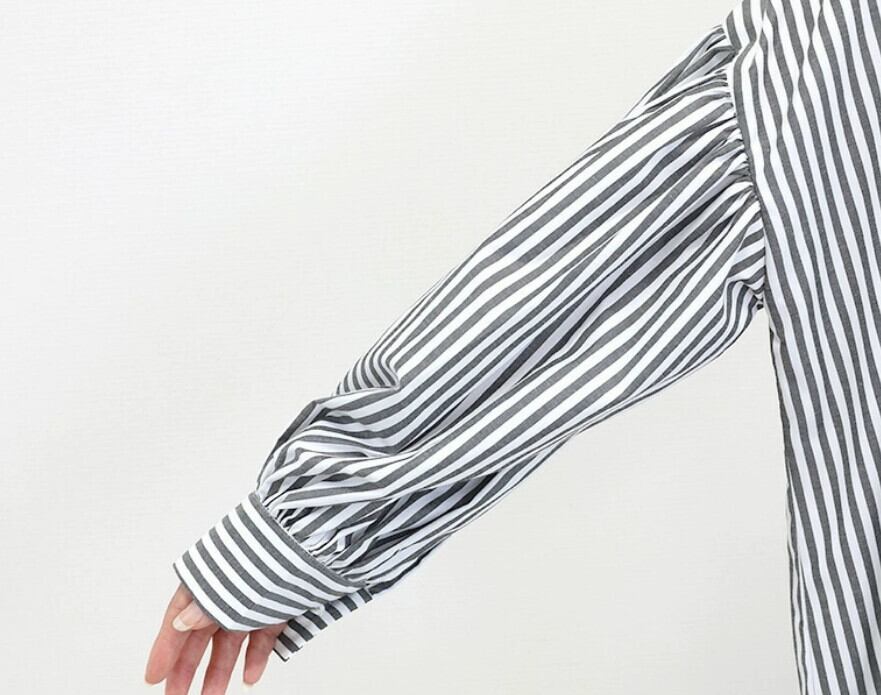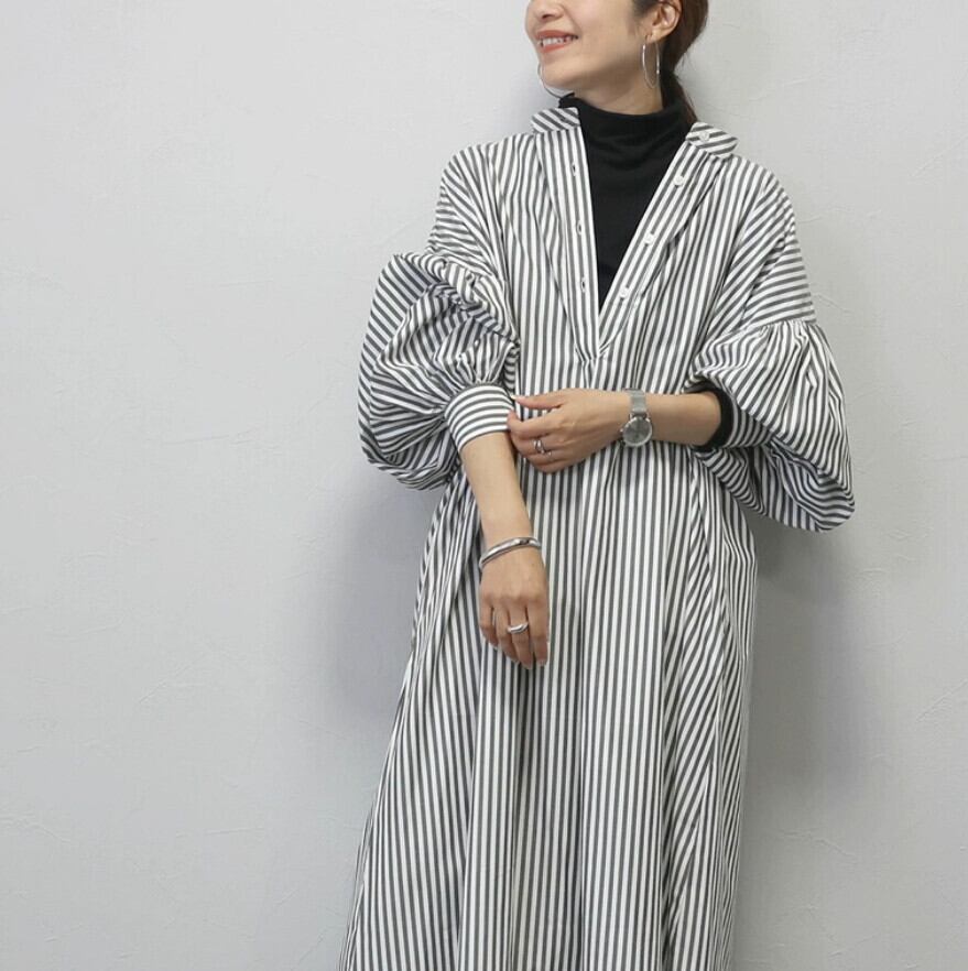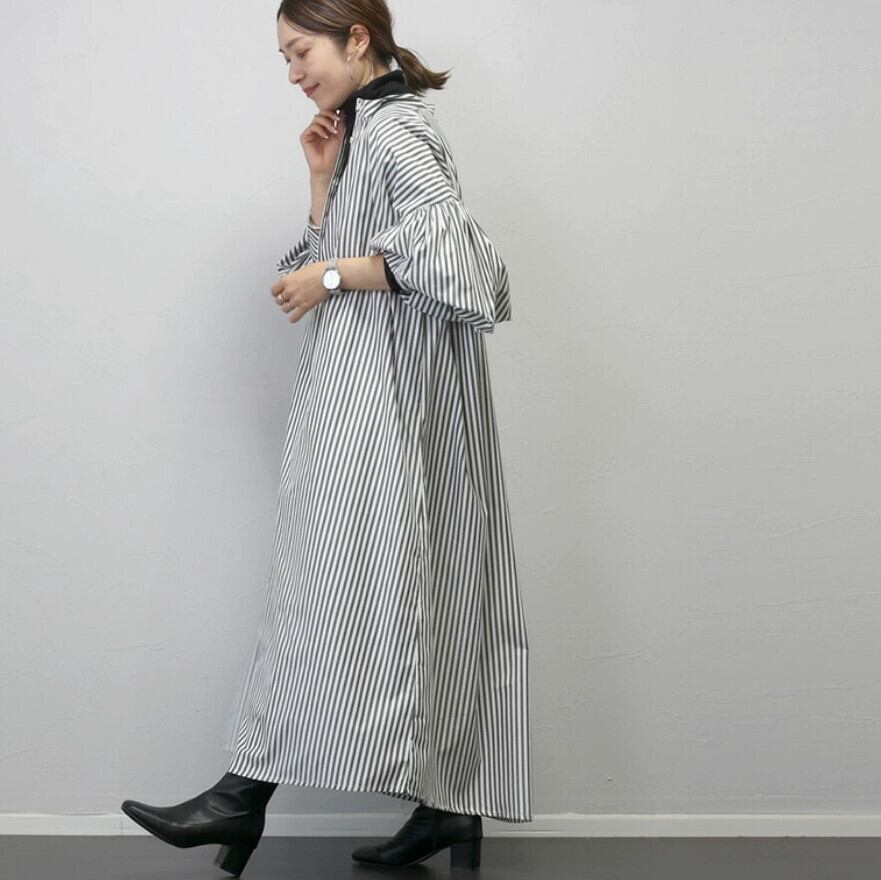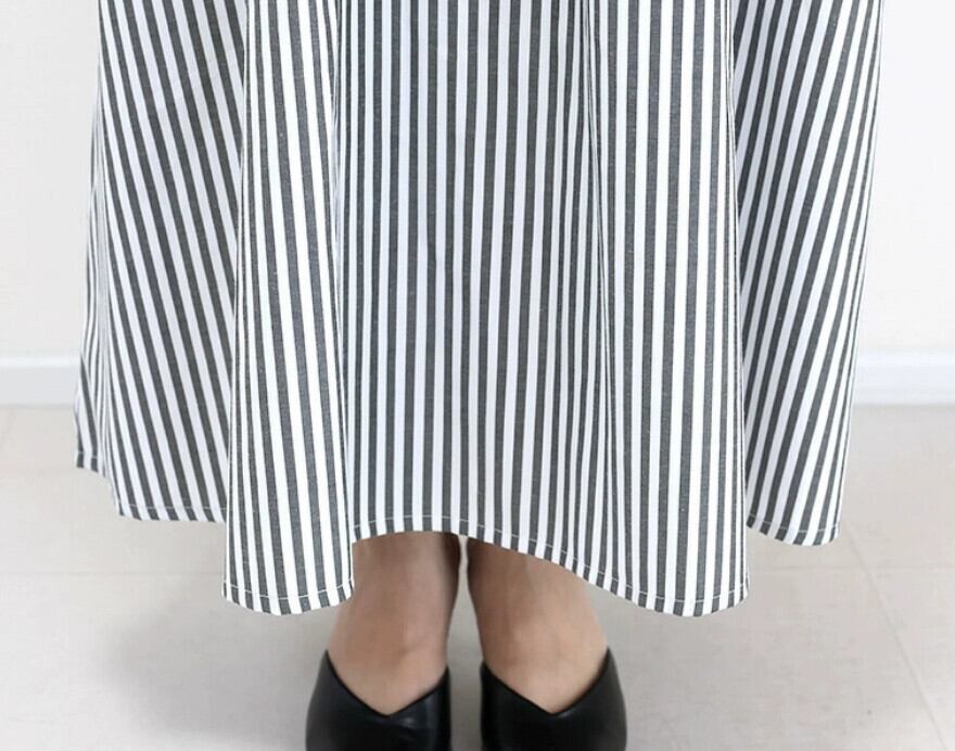 越境楽天 ese スタイルの新しい緩い大きいサイズ長袖ストライプ綿とリネンのシャツドレススタンドアップカラー気質膝丈ロングスカート女性 コットン 大きめサイズ cat835348659041