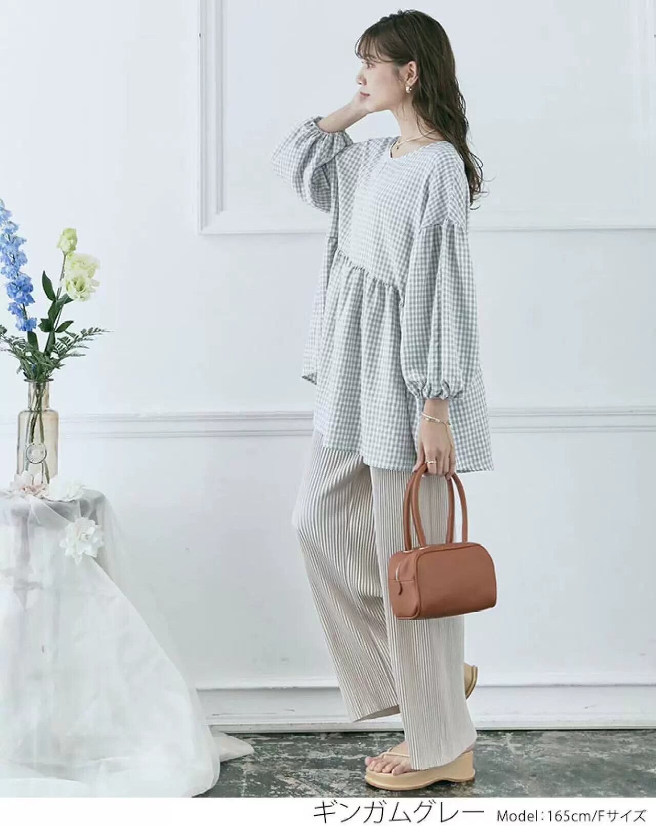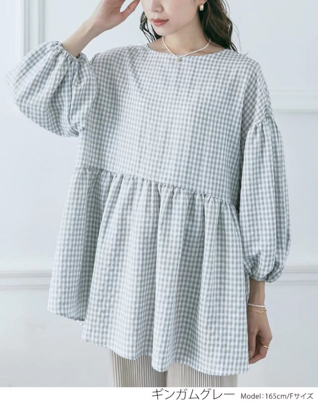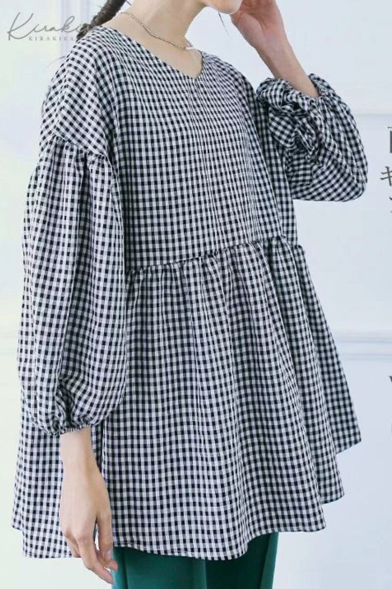 越境貿易春と秋の新作シャツ女性のシンプルなチェック柄ルーズリバーシブルランタンスリーブトップ スプリング 春物 オータム 秋物 cat821956932618