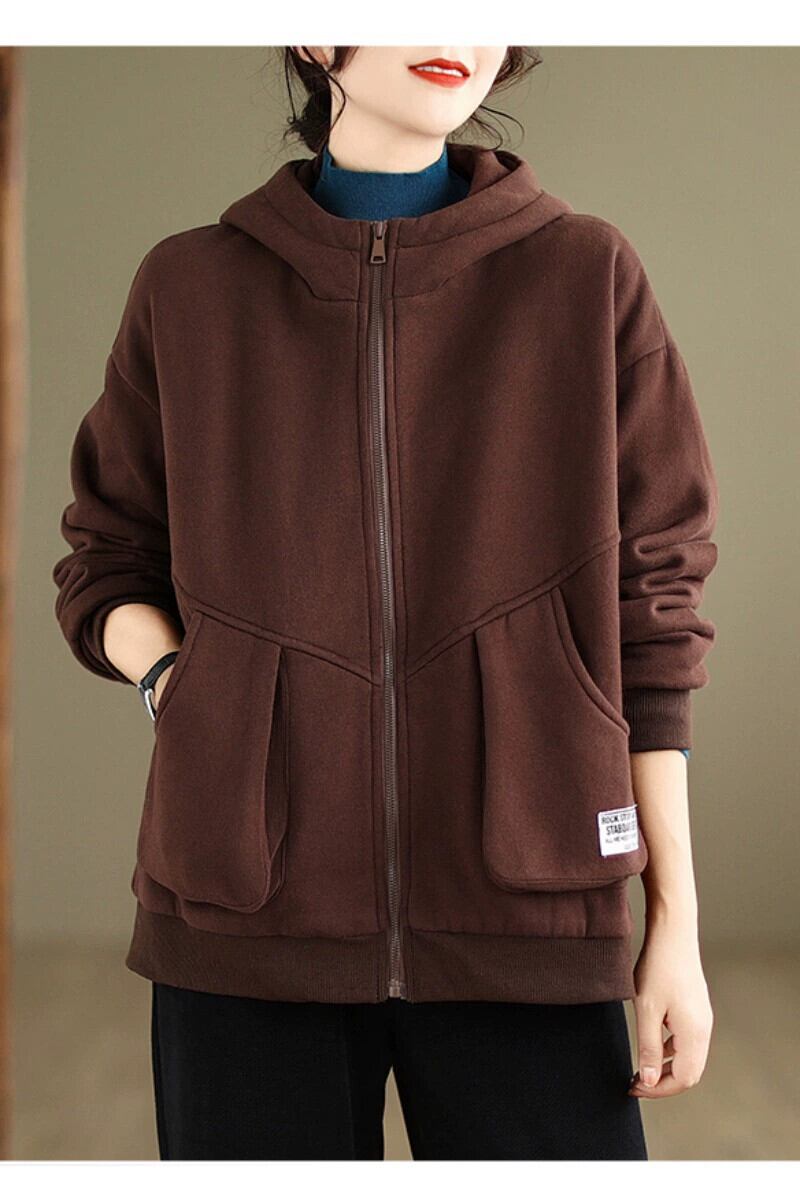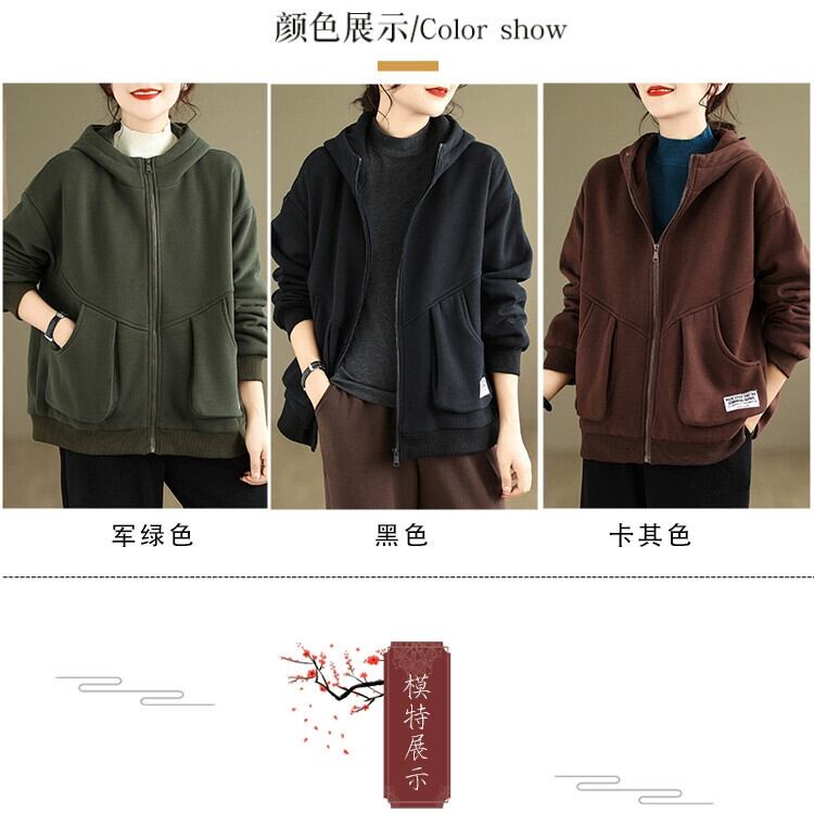 実際の 2023 冬の新しいスタイルのレトロなルーズプラスベルベット肥厚ショートスウェットシャツ女性ルーズでスリムなカーディガンフード付きジャケット ウィンター 冬物 cat819473702004