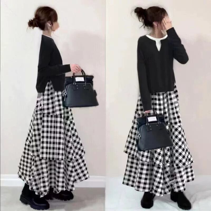 越境ロッテ2023秋冬新作セーター+チェック柄裾ケーキ不規則スカートスーツ既製在庫 オータム 秋物 ウィンター 冬物 cat868264052941