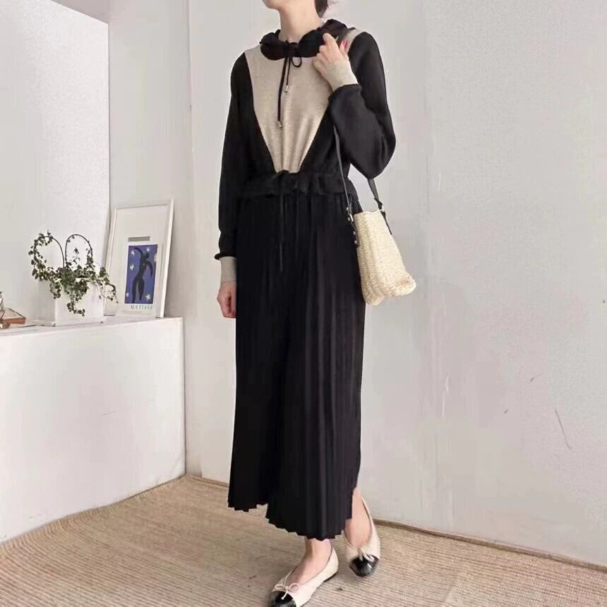 スポットシックなレトロなフード付きレースアップコントラストカラースプライシングウエストデザインスウェットシャツドレス女性 cat867253609310