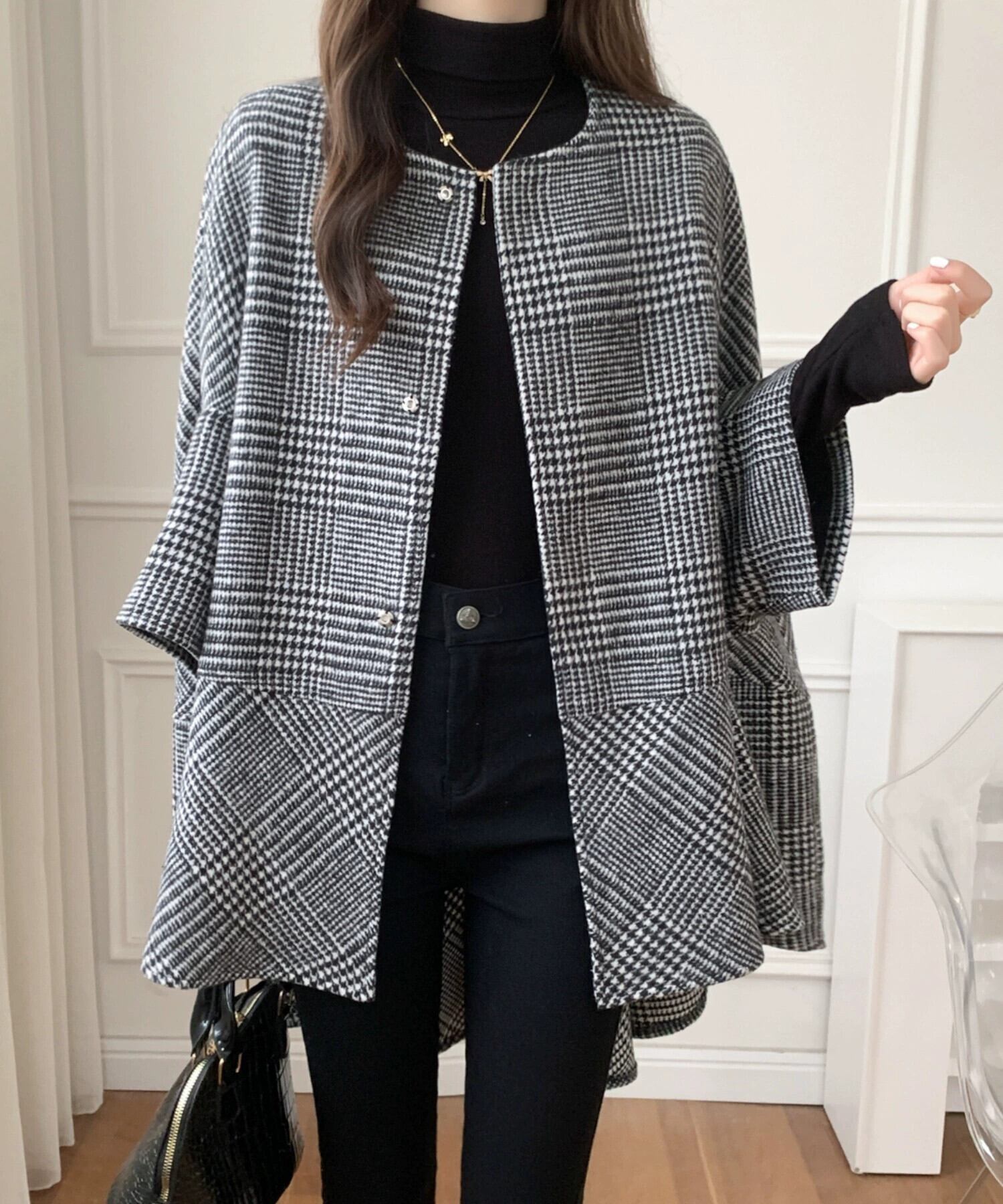 ミドル丈カーディガンラウンドネックチェック柄コートマント女性 2023 秋と冬の新しいスタイルのファッショナブルなコートの女性 オータム 秋物 ウィンター 冬物 Oネック cat832405081085